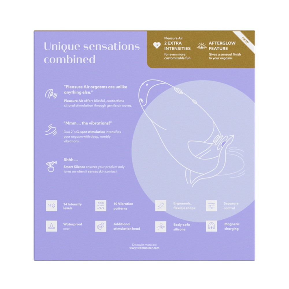 De revolutionaire Womanizer Pleasure Air™ Technology gecombineerd met krachtige G-spot stimulatie – dat is de DUO 2 van Womanizer. Het klassieke Womanizer clitorisopzetstuk bevredigt de vrouwelijke clitoris terwijl de vibrerende arm, die zich perfect aanpast aan de vrouwelijke contouren, de G-spot op een heerlijke manier stimuleert.