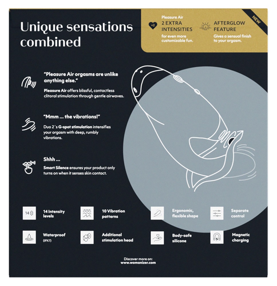 De revolutionaire Womanizer Pleasure Air™ Technology gecombineerd met krachtige G-spot stimulatie – dat is de DUO 2 van Womanizer. Het klassieke Womanizer clitorisopzetstuk bevredigt de vrouwelijke clitoris terwijl de vibrerende arm, die zich perfect aanpast aan de vrouwelijke contouren, de G-spot op een heerlijke manier stimuleert.